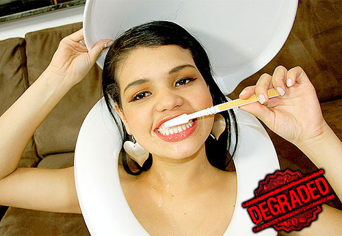 This eighteen year old girl loves cock, not only does she love it but she loves it rough and dirty. When she heard about our website she knew this was the spot for her. She tracked down Bruno in South America and told him she'd do anything to be on the site, she did anything and everything and we got it all on tape. She loves fucking guys and being treated like dirt, so what better place for her than here at Human Toilet Bowl.com! |